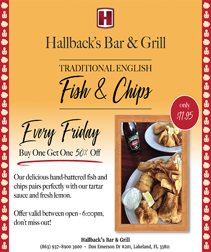 Buy One Get One Half Off on Friday's! Our delicious hand-battered fish and chips pairs perfectly with our tartar sauce and fresh lemon.